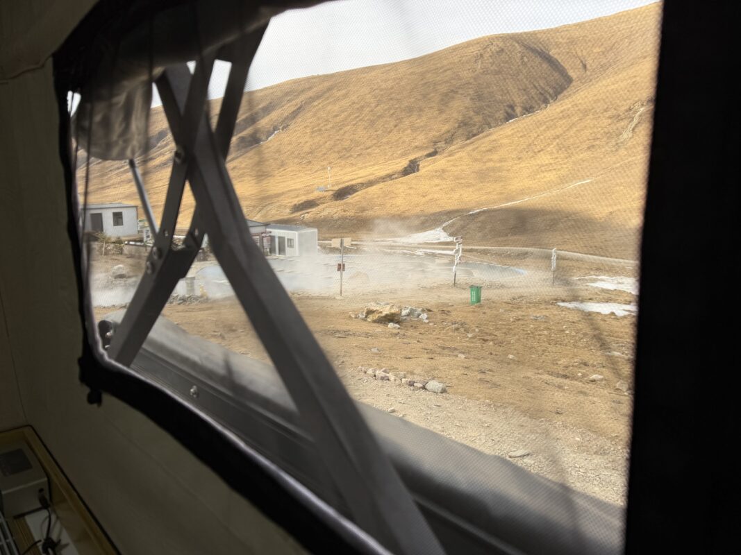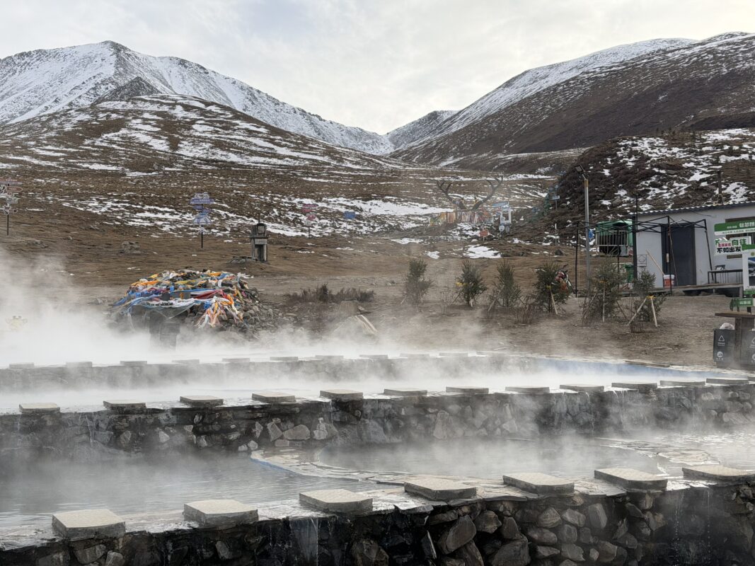 此刻,包忽图温泉在四千米的海拔线上静静蒸腾。乳白色的水汽袅袅升起,将雪山与流云一同揉进清澈的水面里。乒乓从水中跃上岸边,