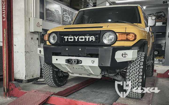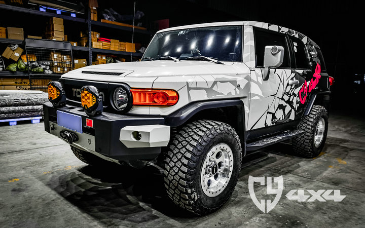 材质钢,配杠内雾灯带绞盘托架、水箱护板、射灯安装位。固定于大梁原车位安装,适用于FJ车型