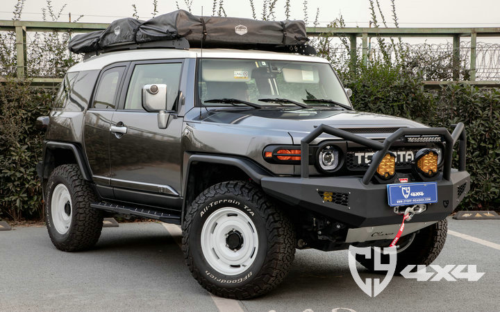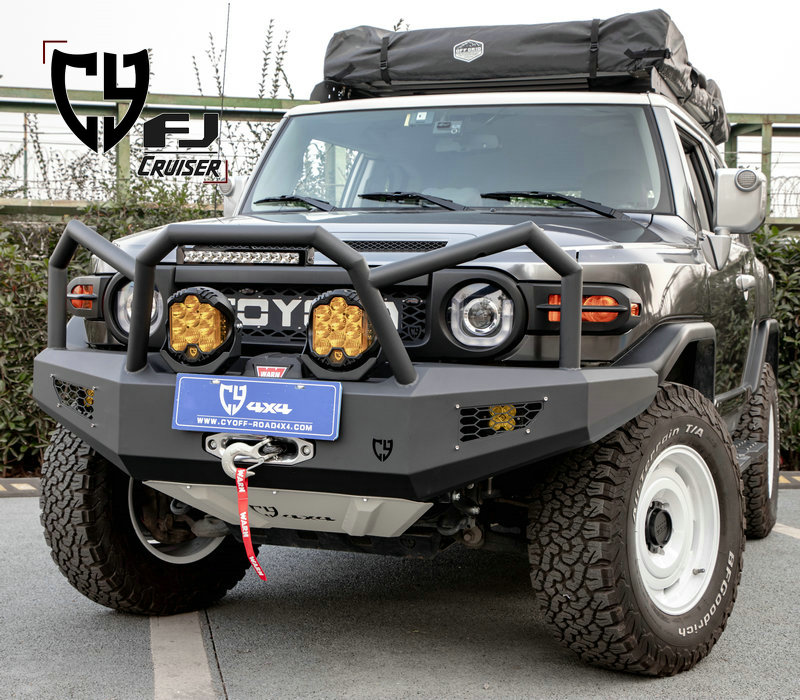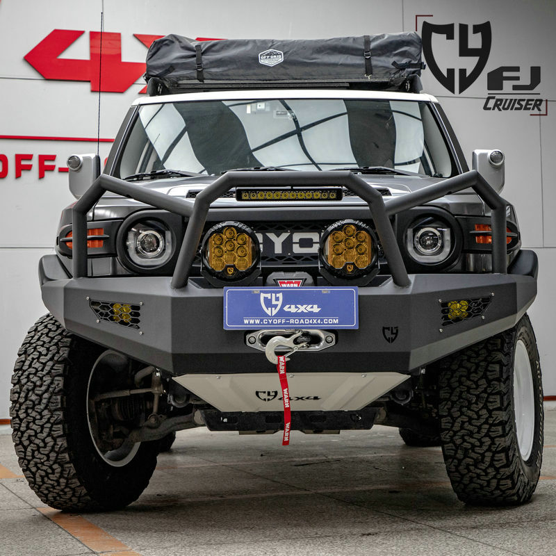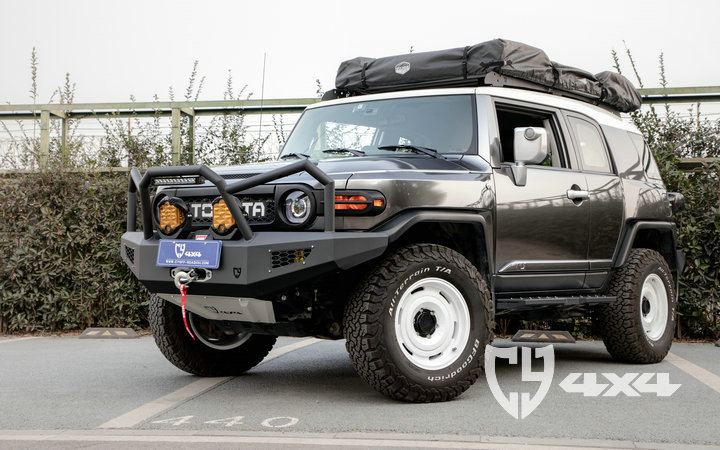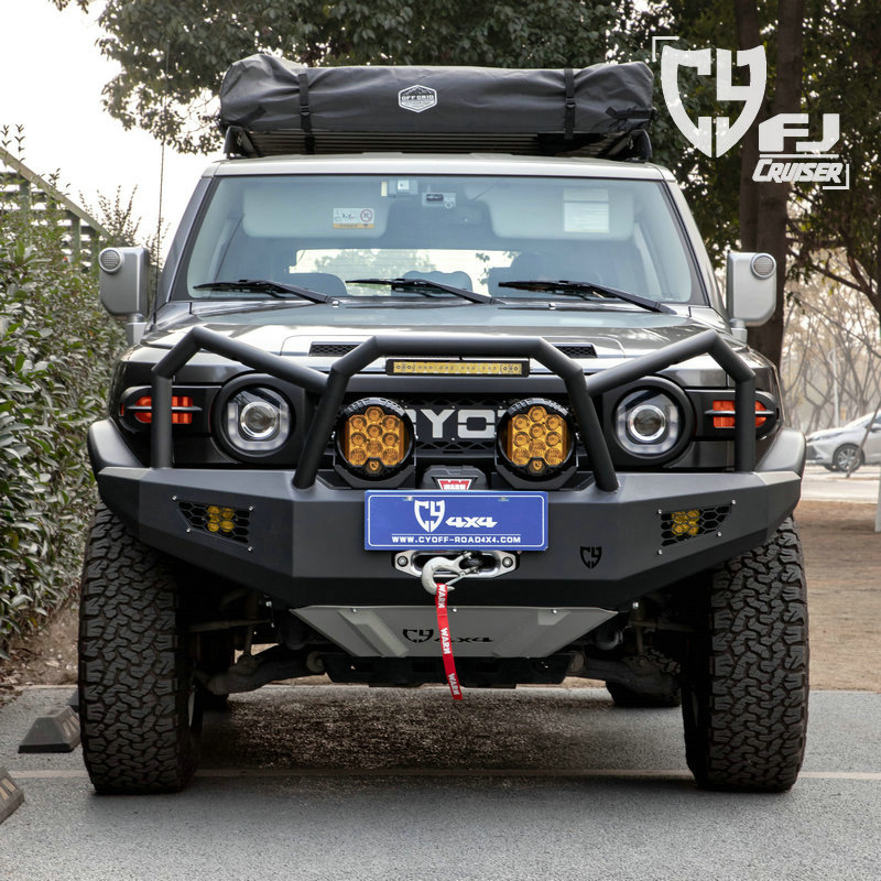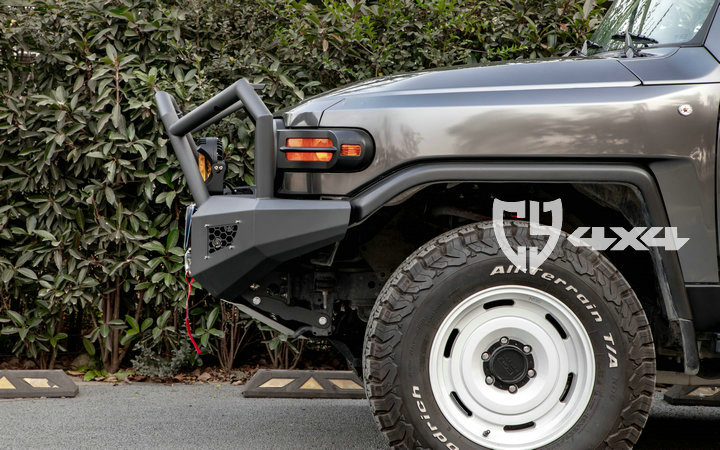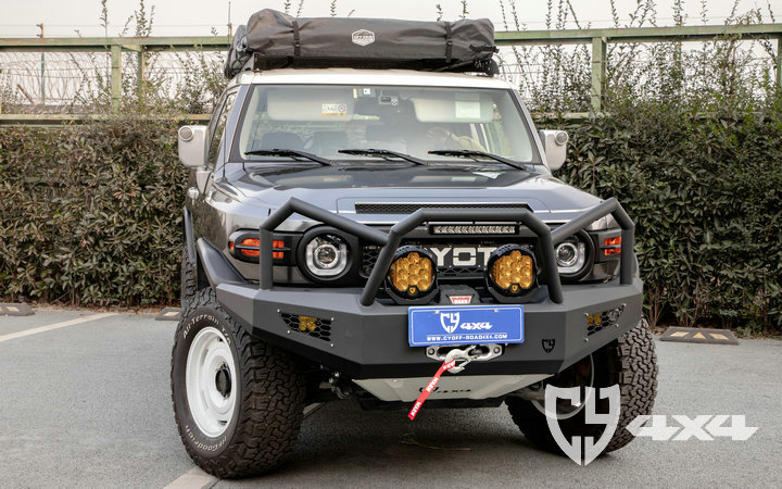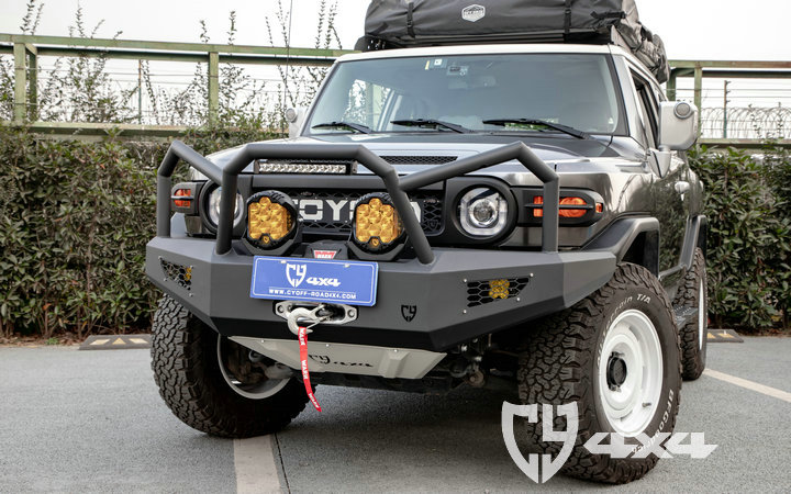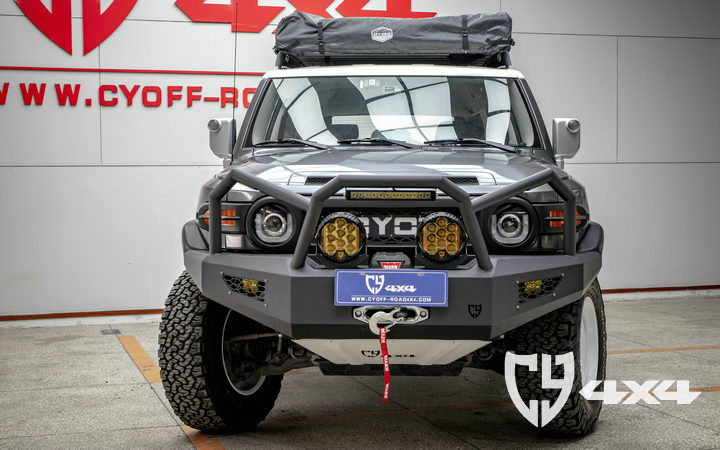 材质钢,带绞盘托架、水箱护板、射灯安装位。固定于大梁原车位安装,适用于FJ车型