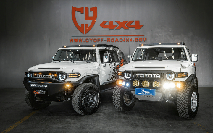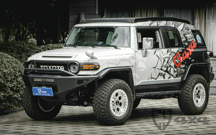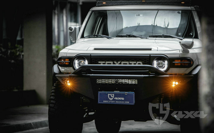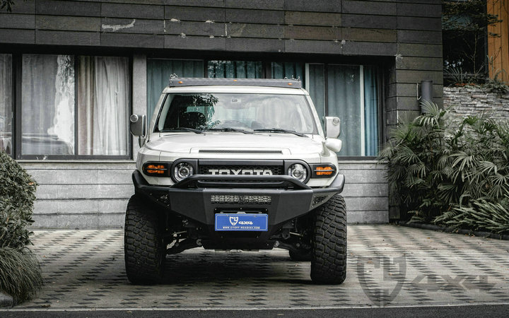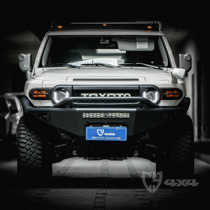 材质钢,配杠内两侧雾灯带绞盘托架、可拆卸管式护栏、射灯安装位。固定于大梁原车位安装,适用于FJ车型