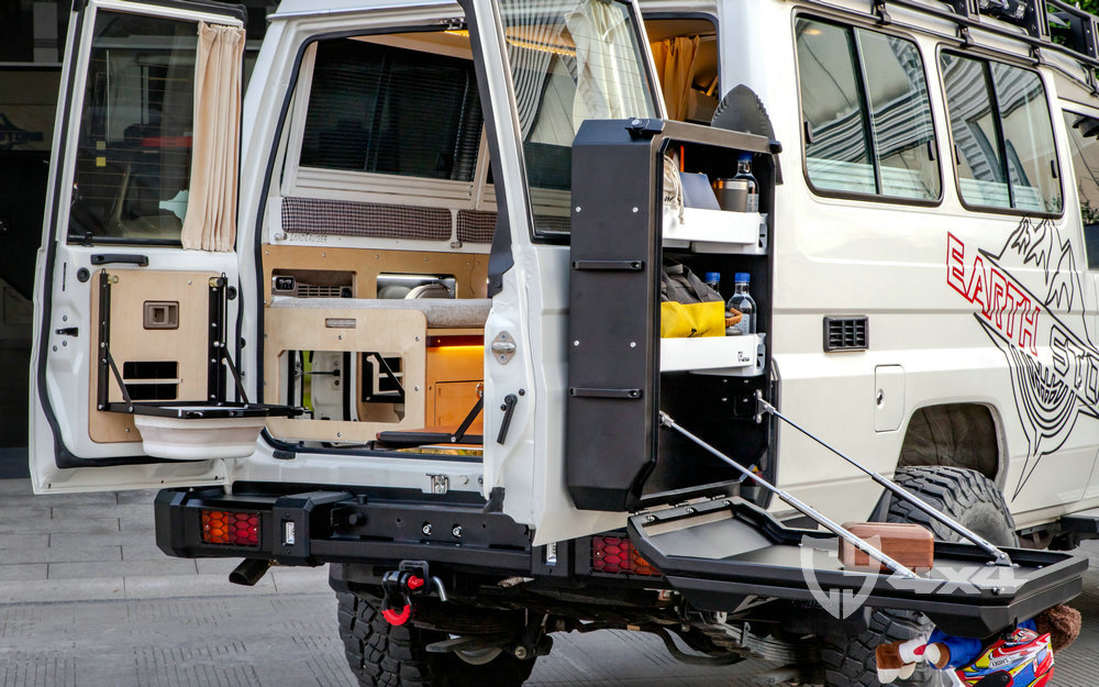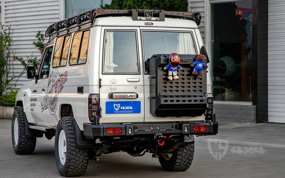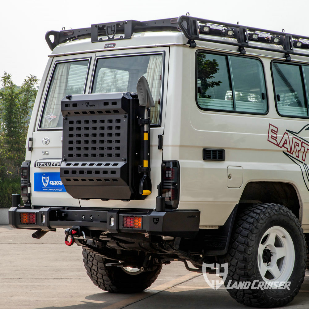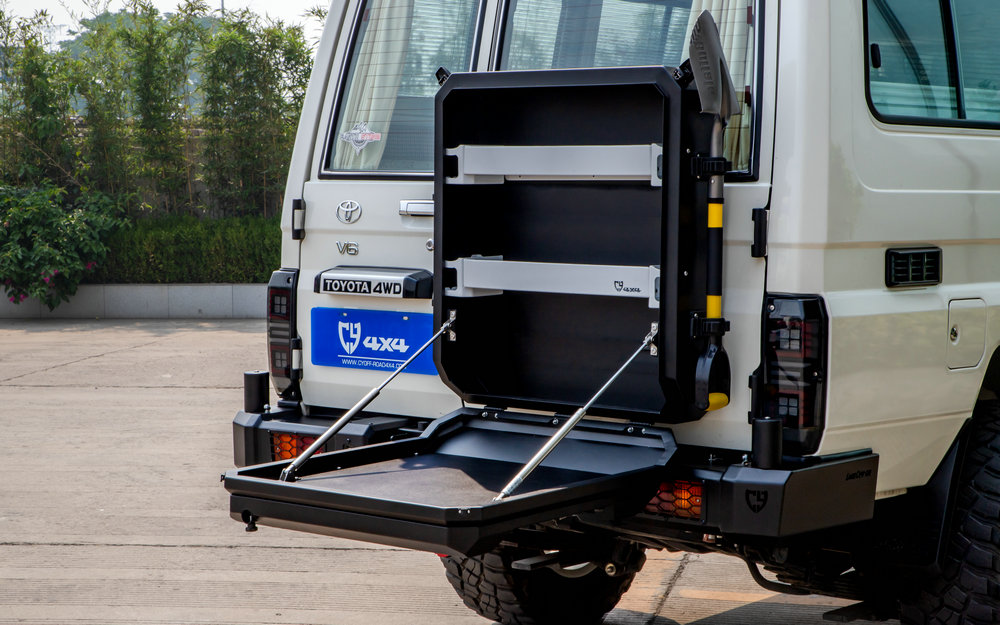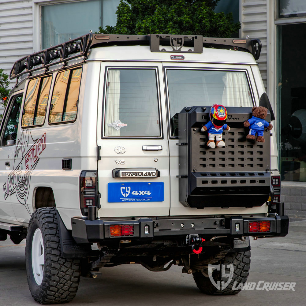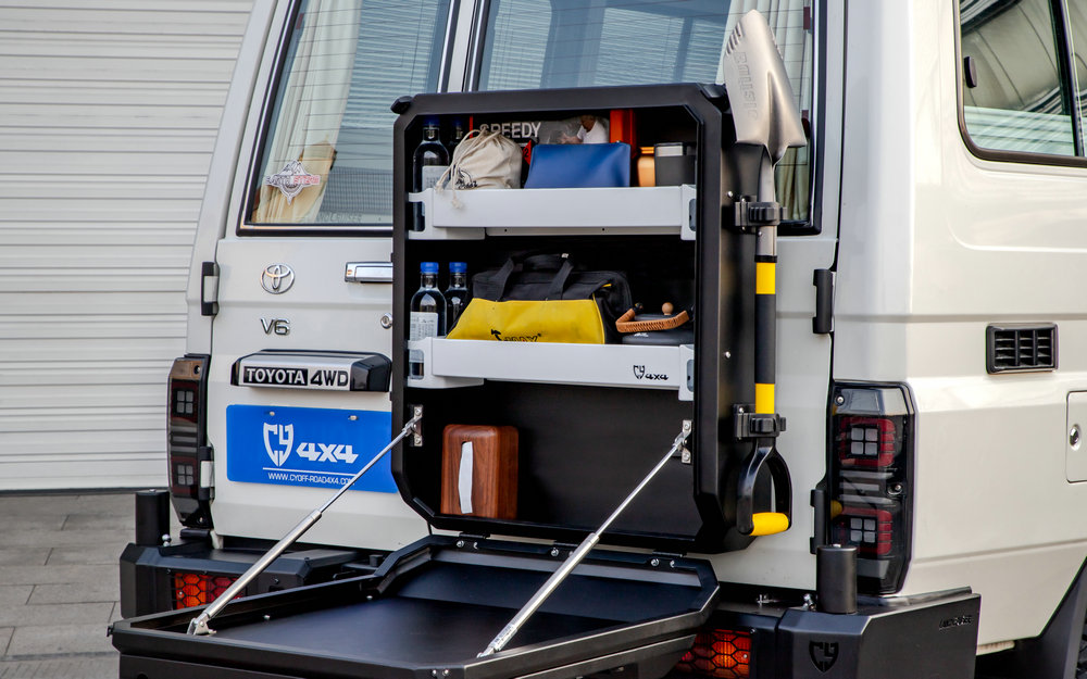 适用于LC71/76/78尾门固定的铝制储物箱,利用原车备胎孔位安装,带锁具设计。120L容量、上下开合门(打开变成工作台)、内置分层储物格,外部集成旗杆座、工兵铲和拓展板。