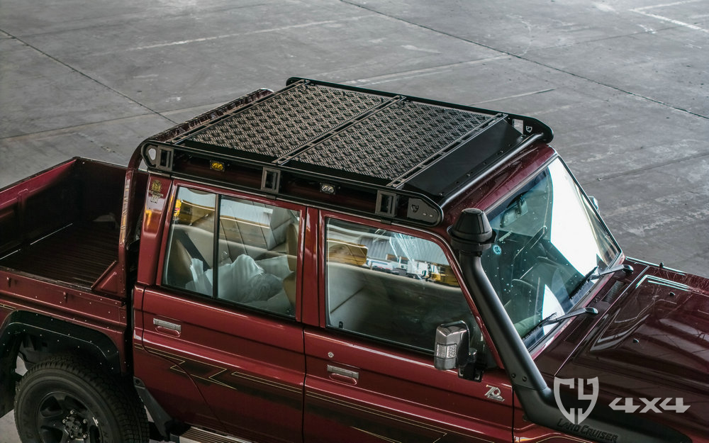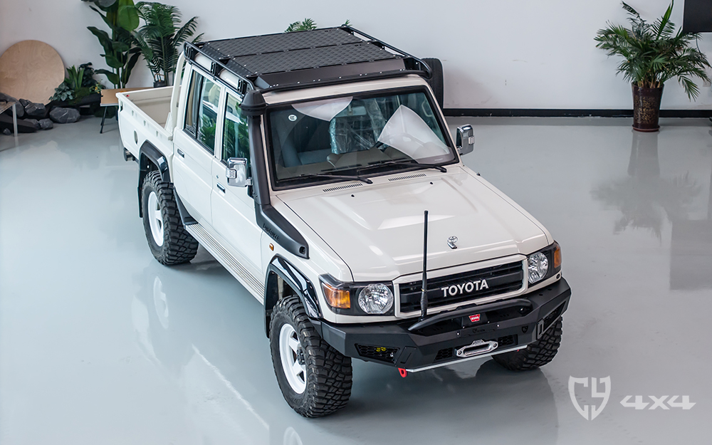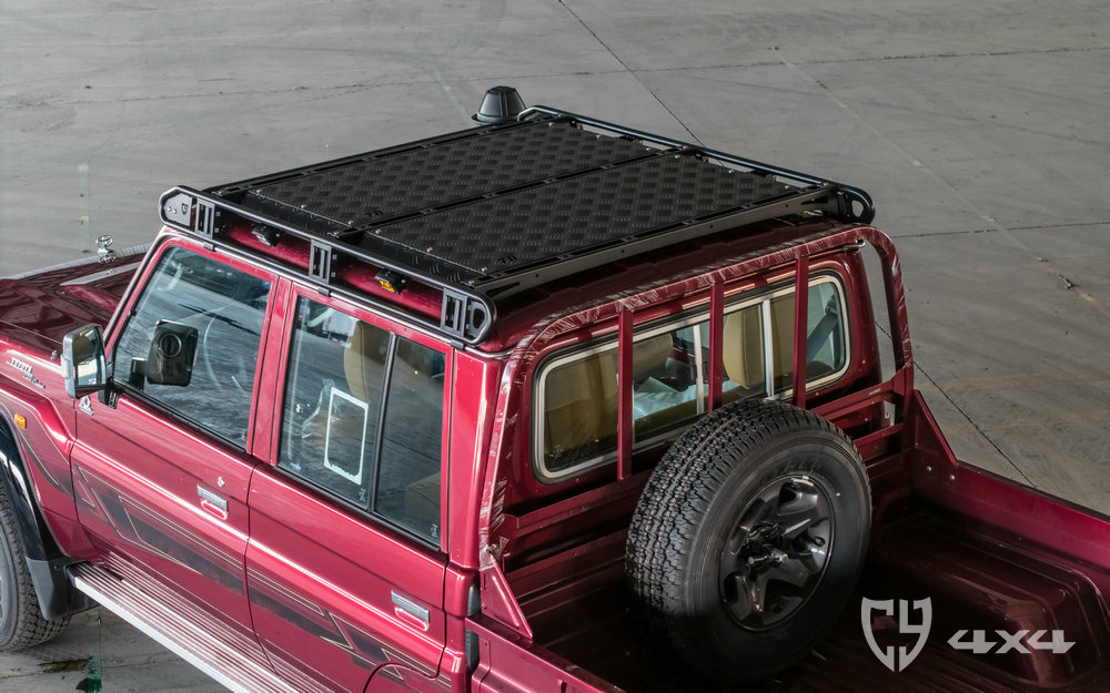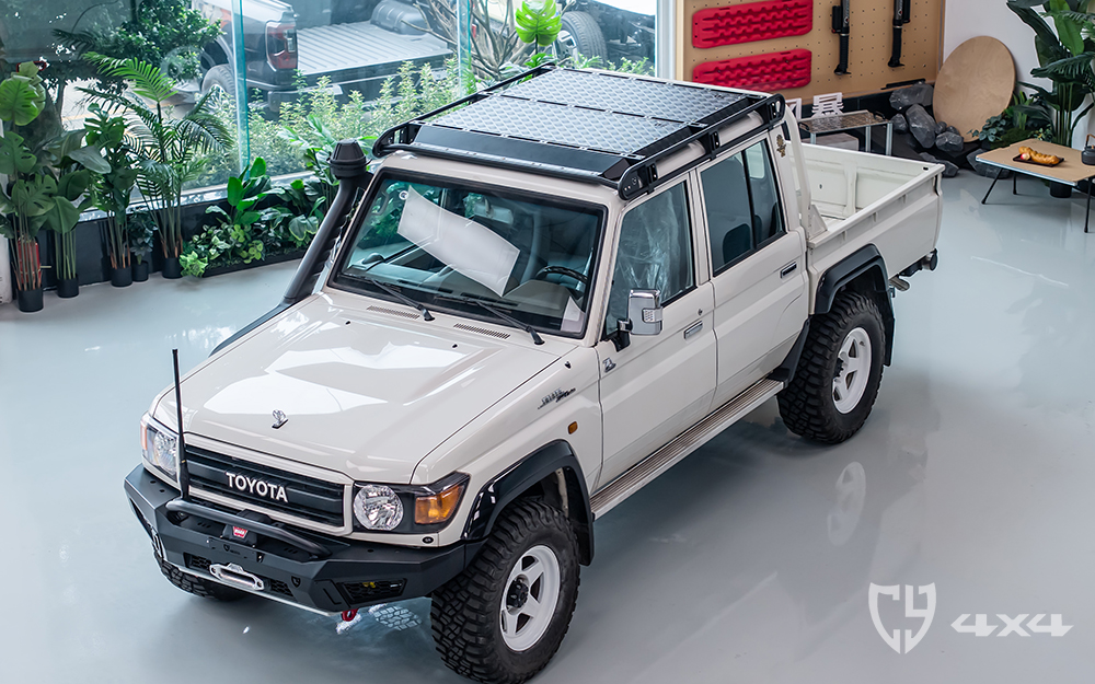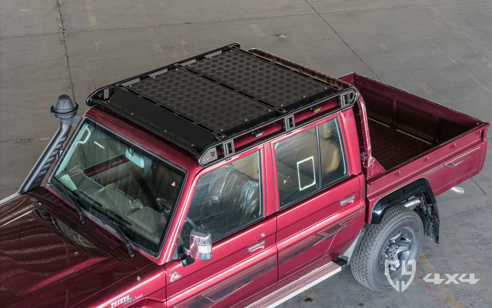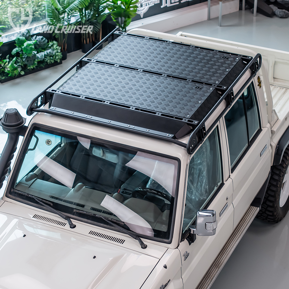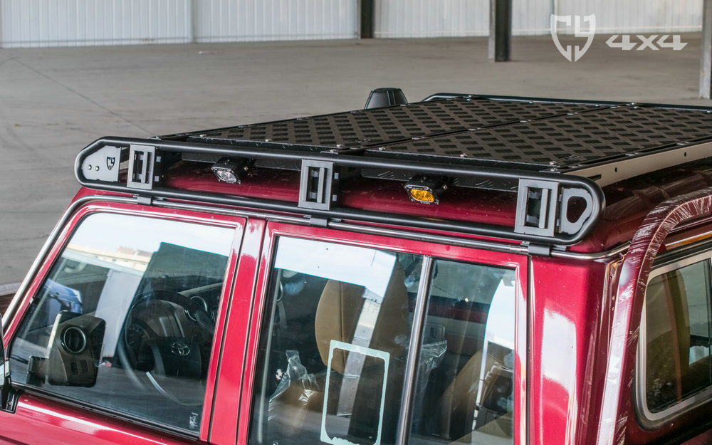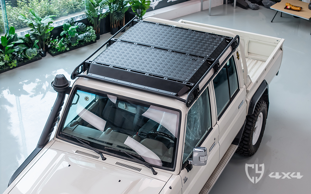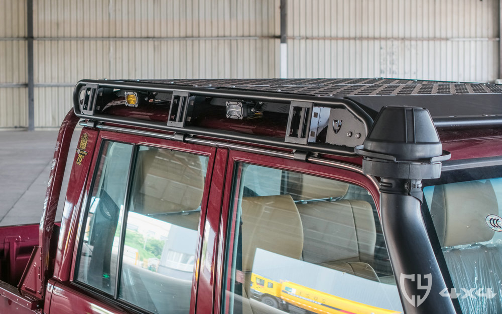 行李架顶部拓展平面及加固横梁材质铝,两侧拓展长条支架、射灯架材质不锈钢。固定于车顶流水槽。适用于丰田酷路泽LC79