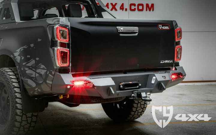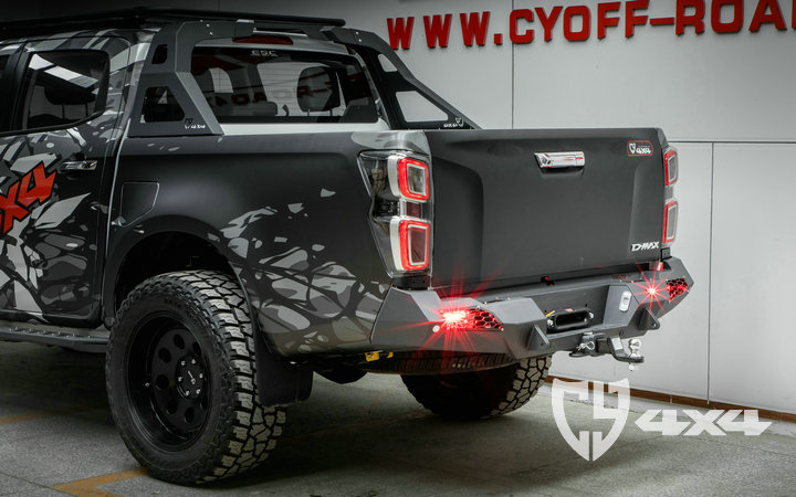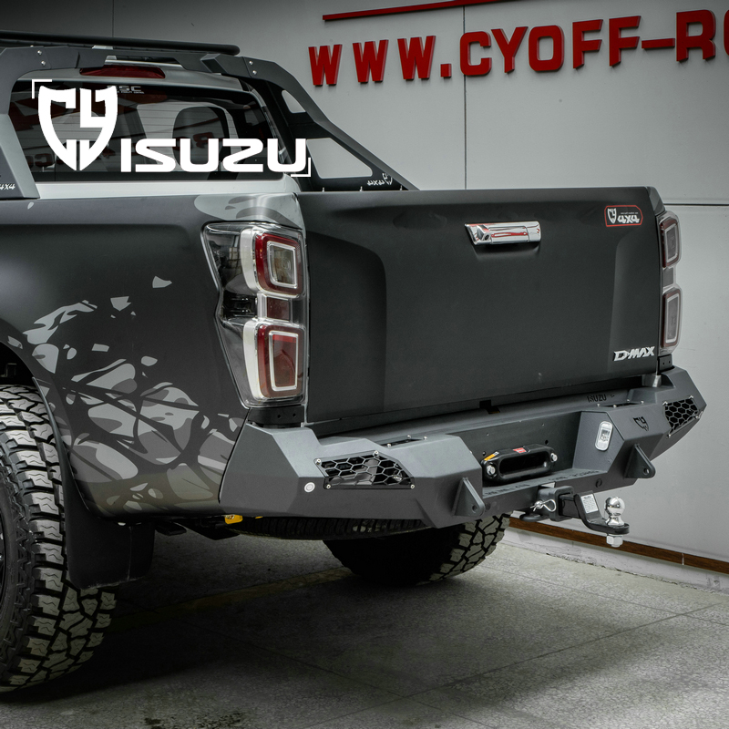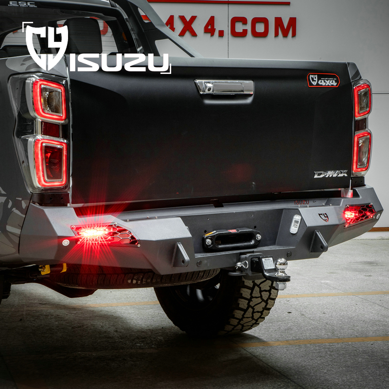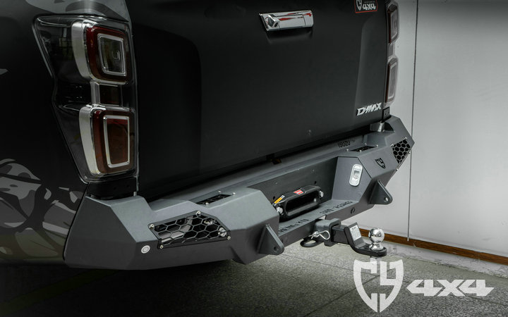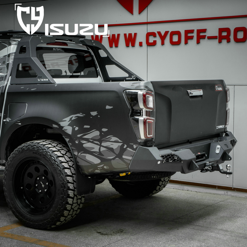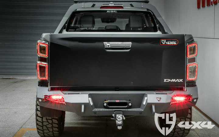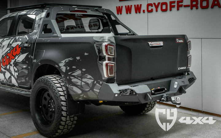 材质钢,带绞盘托架,带拖车方口,配杠内灯,预留雷达安装孔。固定于大梁原车位安装。适用于五十铃新款dmax