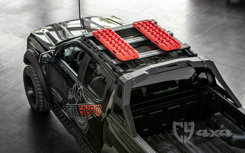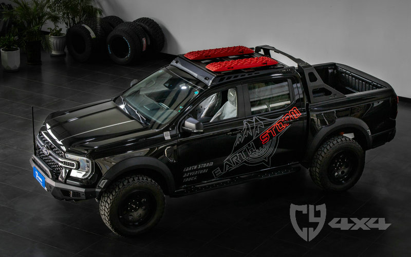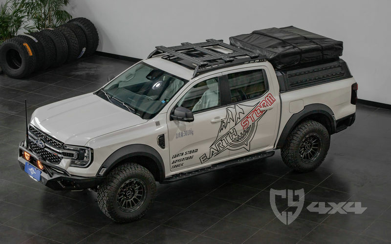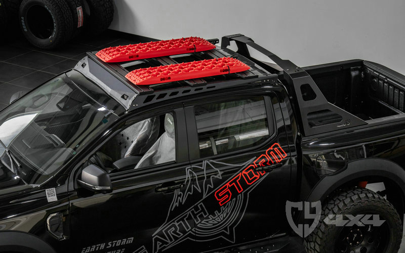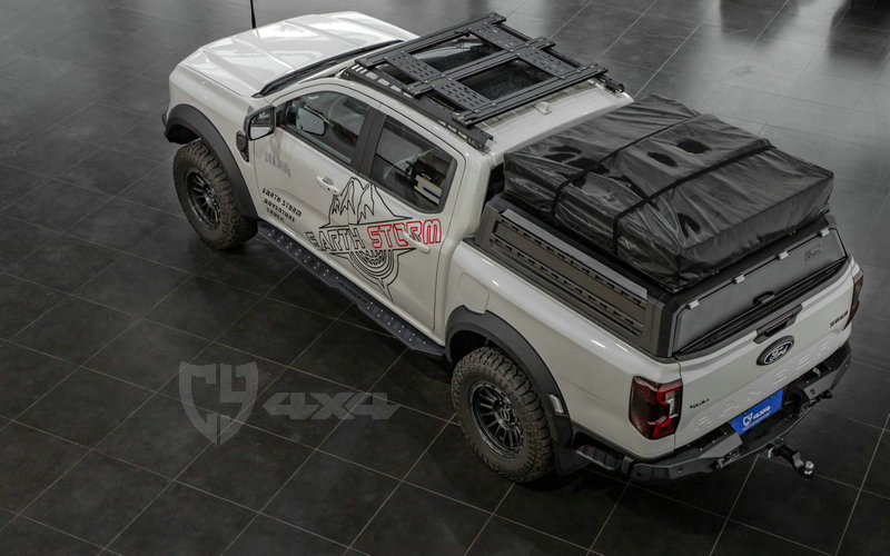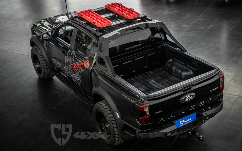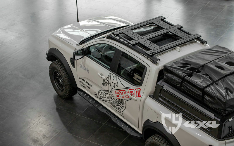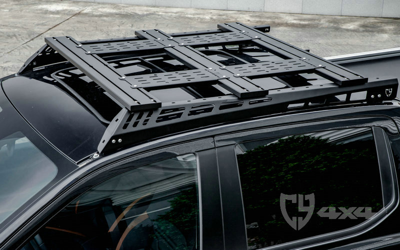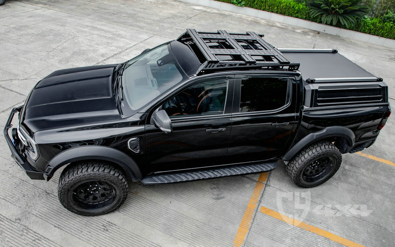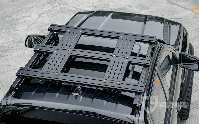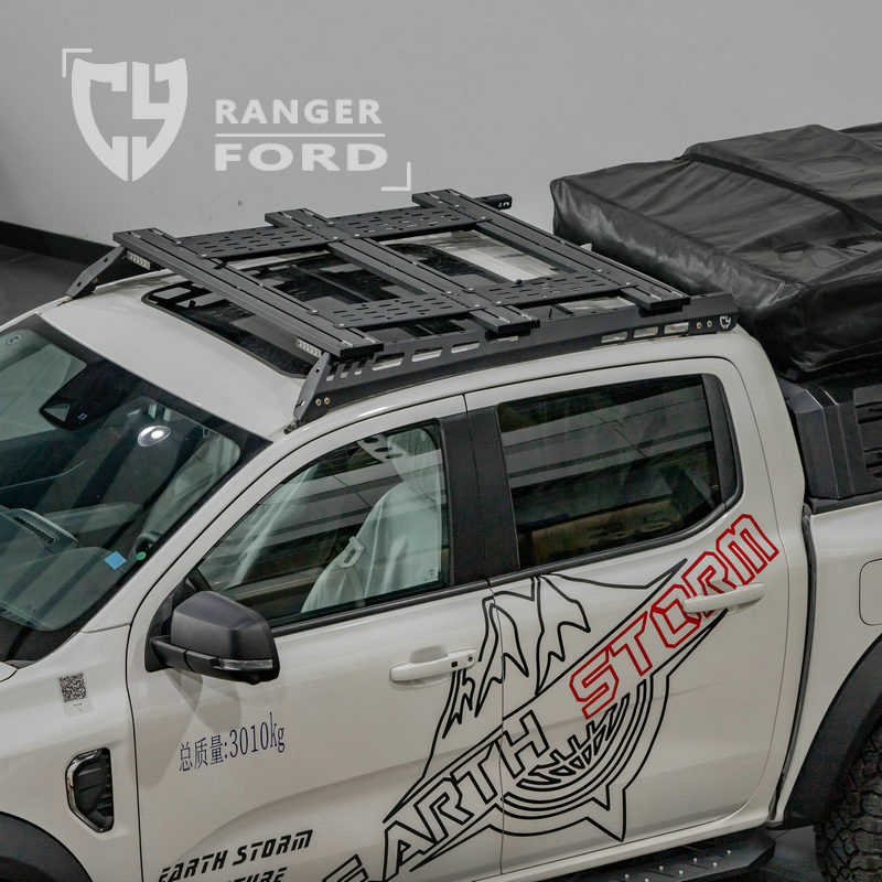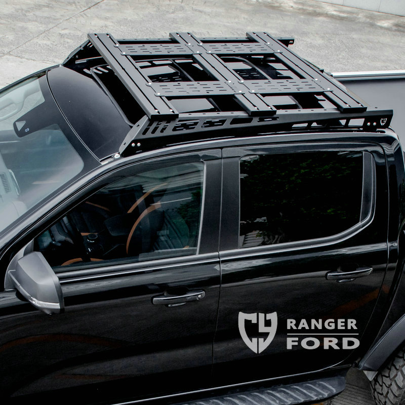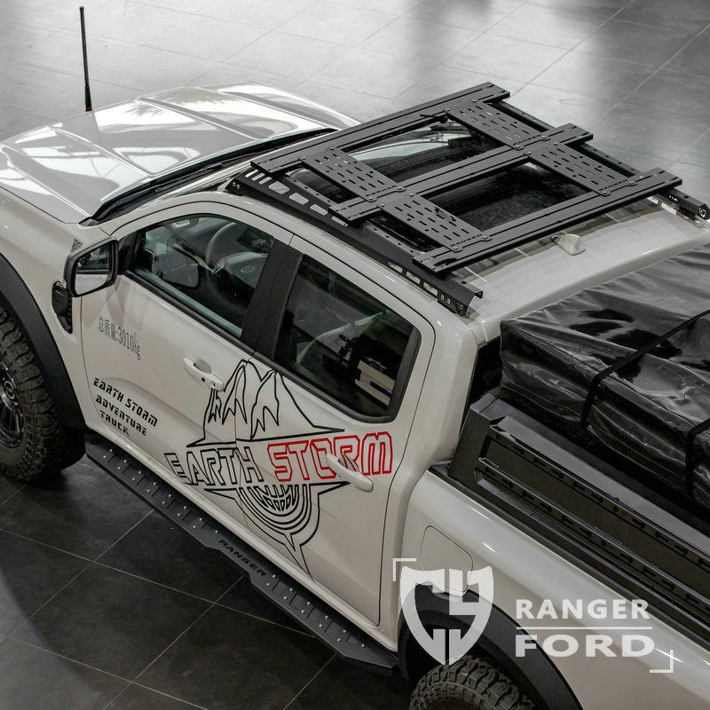 两侧纵轨及拓展平面材质钢,横杆材质铝合金,原车位安装。带射灯安装位、配安装配件、扰流板。适用于福特ranger游骑侠